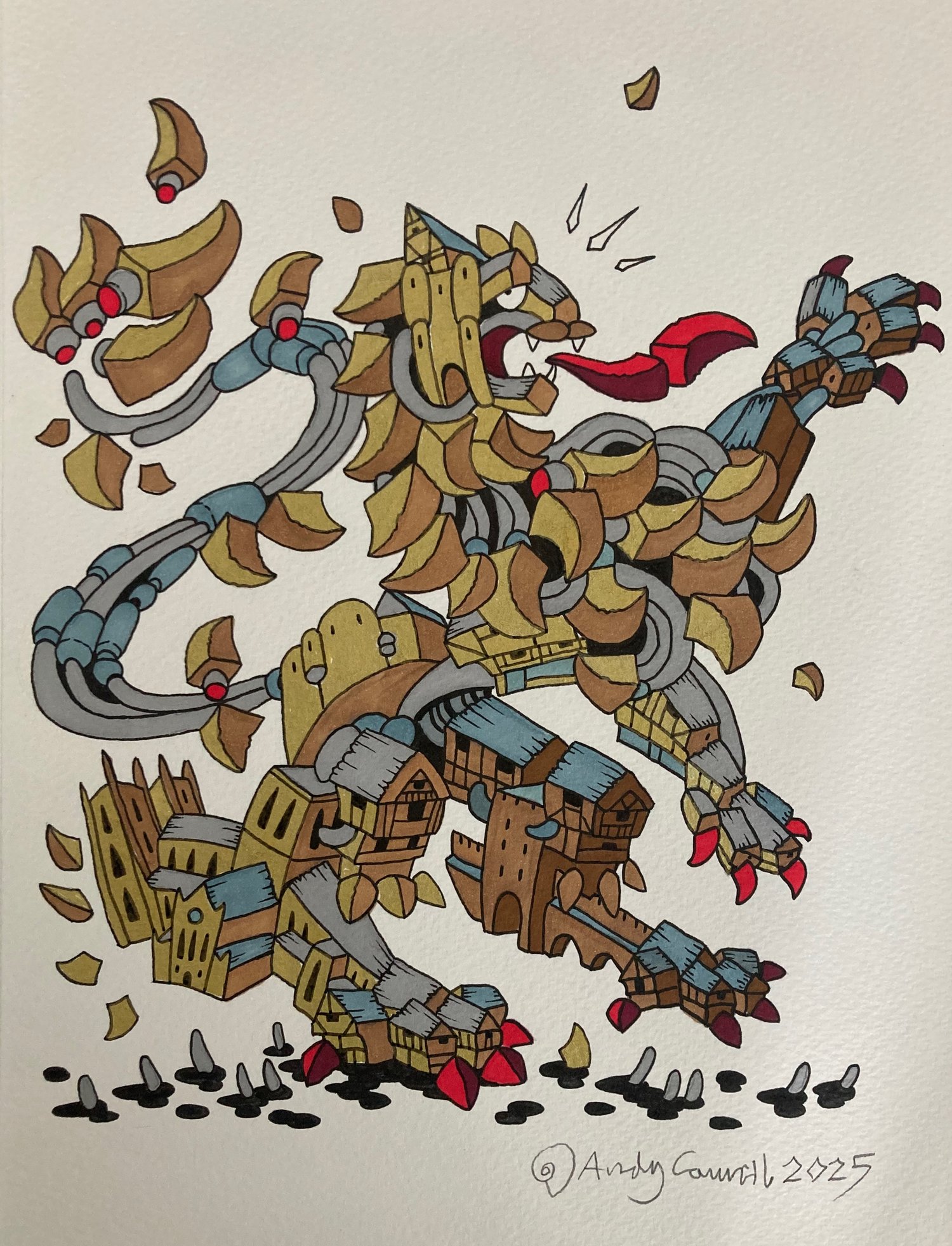 Heraldic Lion original artwork- reds, browns, greys and gold accents.